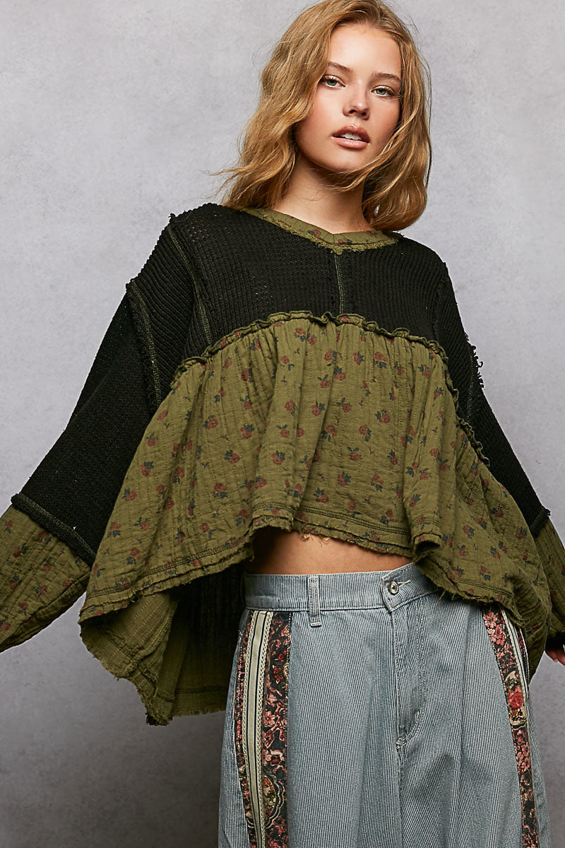 Designed in V-neck balloon sleeve roomy fit top in cut and sew sweater knit with gauze print patch, outseam, overlock stitch point, reverse ruffle bottom opening detail, vintage washing, solid color.