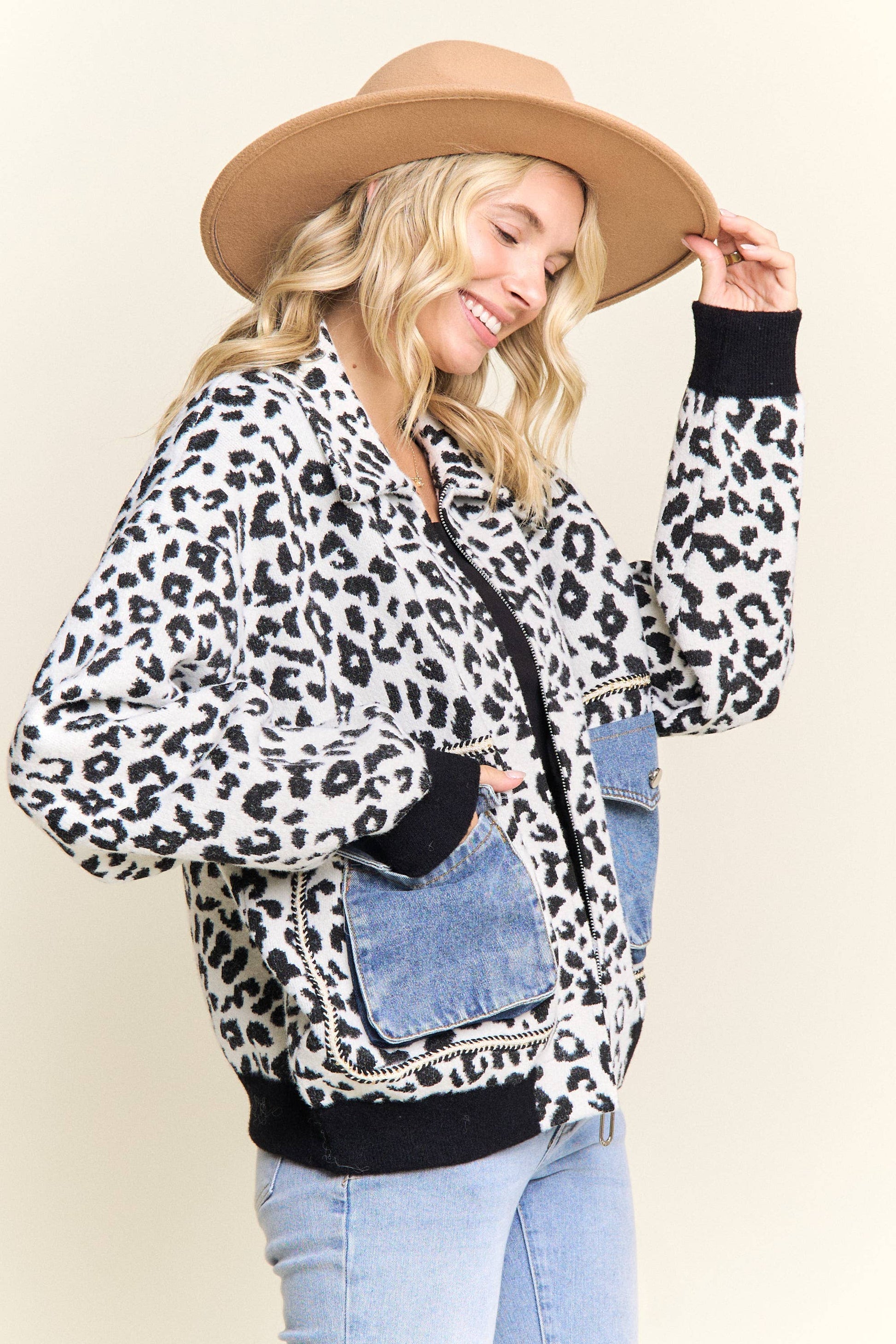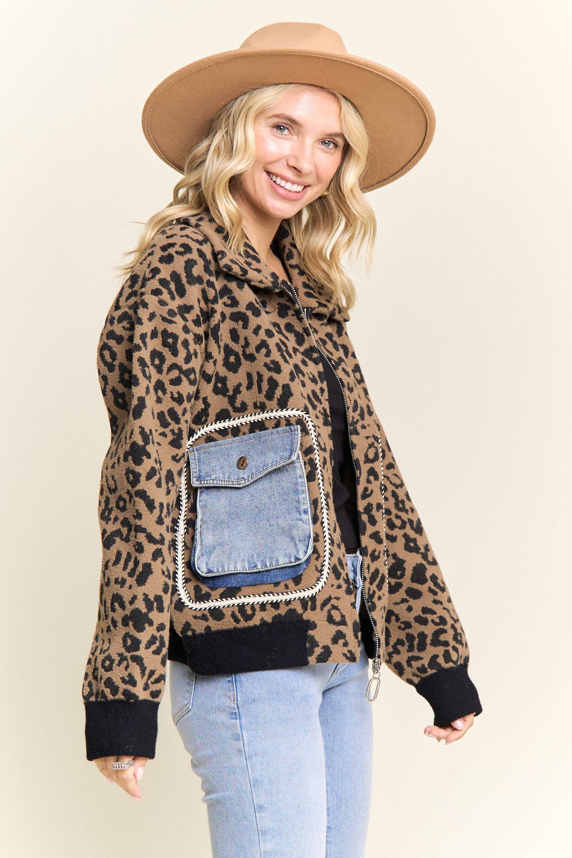 LESW4150-LEOPARD PRINT JACKET WITH DENIM POCKETS: Brown / ONESIZE(6)