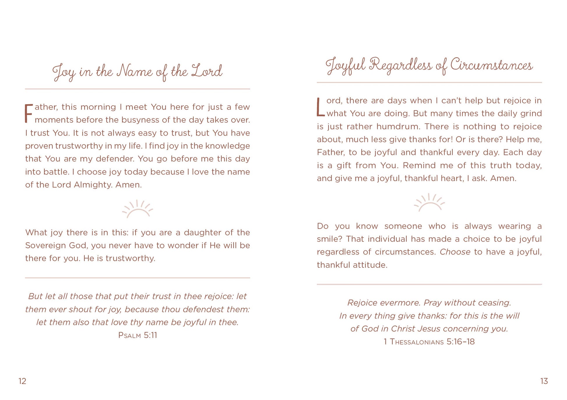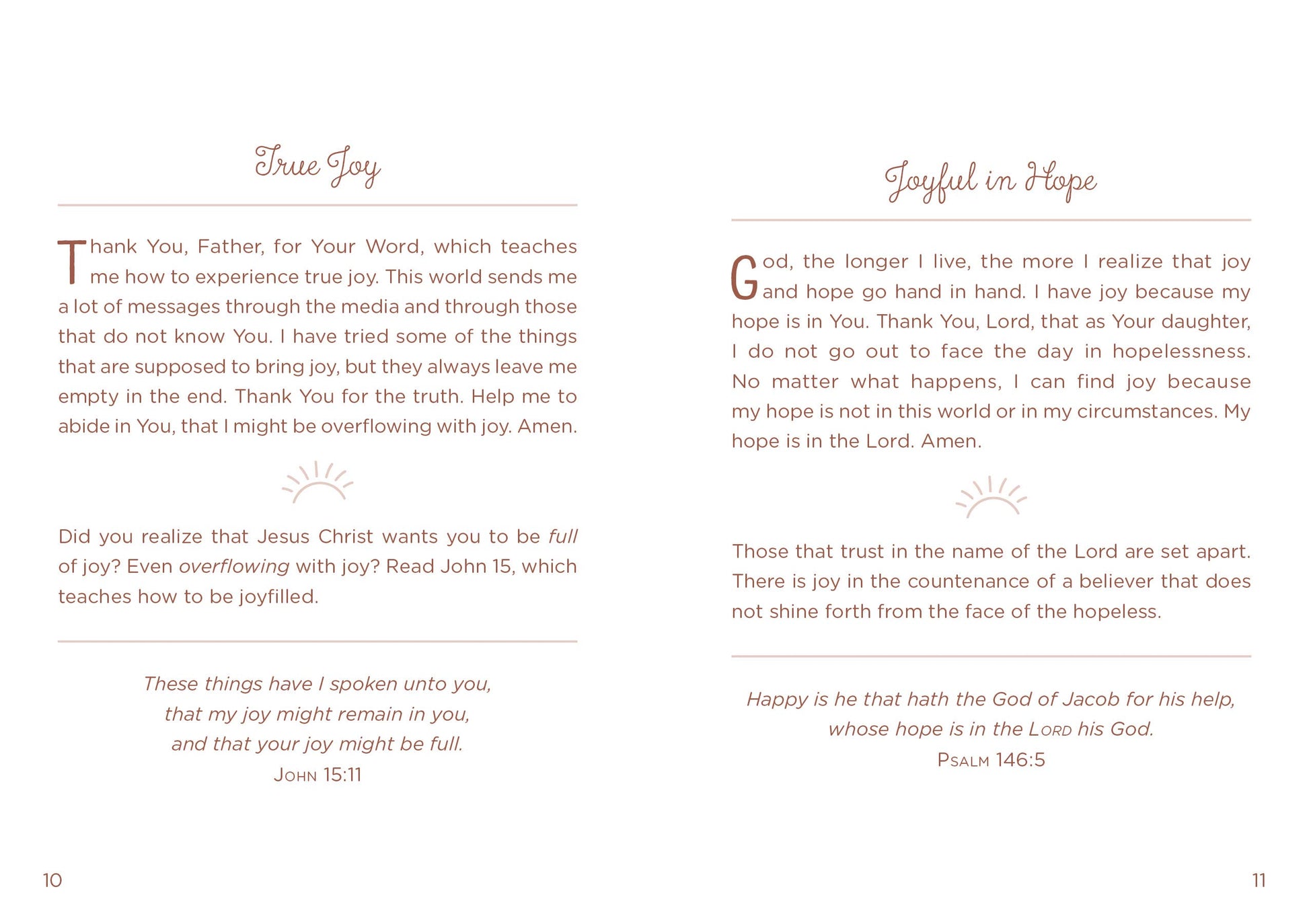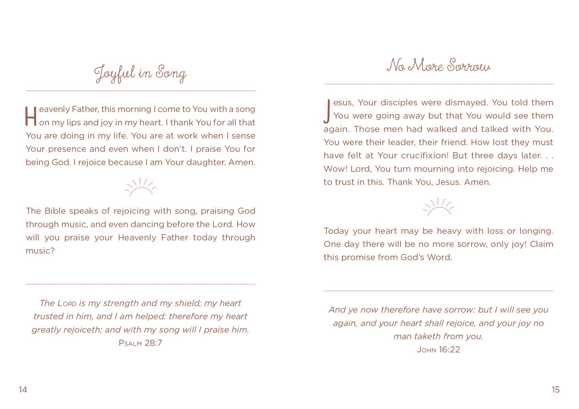 What better way to guarantee a good morning than to spend time in prayer? Mornings with God encourages women to do just that to set aside a few minutes each day for quiet time with God. Dozens of topically arranged, faith-building prayers are accompanied by inspiring devotional thoughts and scripture selections from the beloved King James Version of the Bible. The just-right-sized readings will fit perfectly into the busy morning routines of women of all ages, promising a great start to any day of the week!